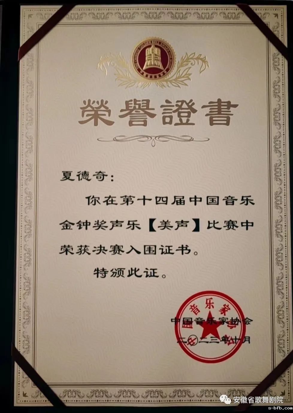 新利18福利彩票(安徽省演出公司)青年男高音夏德奇一路过关斩将晋级决赛,与其他11名决赛选手经过紧张激烈的角逐,最终以97.95分排名第六,荣获第十四届中国音乐金钟奖声乐(美声)比赛决赛入围奖。