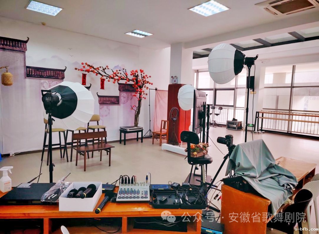 徽风皖韵背景墙,三个补光灯,一台照相机,一台电视机,一个操控台,这就是我们的直播间。