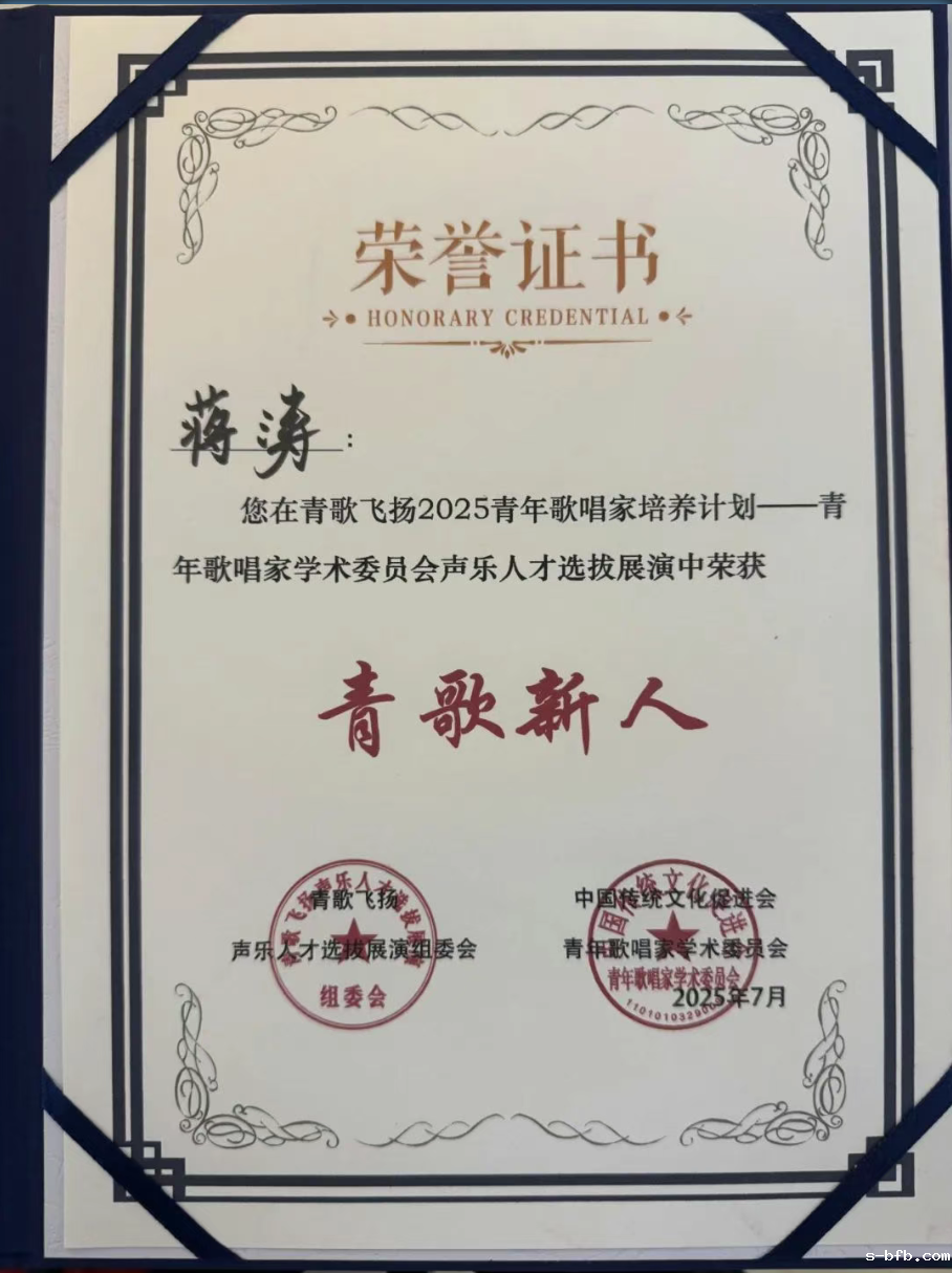 近日,我院优秀青年演员蒋涛凭借精彩的安徽民歌演绎,在“青歌飞扬”2025青年歌唱家培养计划声乐人才选拔展演中崭露头角,荣获民族组“青歌新人”荣誉称号。